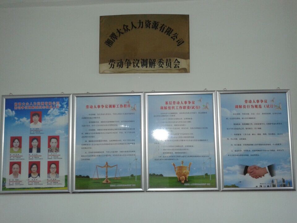 為了規(guī)范勞動(dòng)人事爭(zhēng)議預(yù)防調(diào)解處理工作,維護(hù)社會(huì)和諧穩(wěn)定,按照潭人社發(fā)【2014】29號(hào)文件要求,根據(jù)《中華人民共和國(guó)勞動(dòng)爭(zhēng)議調(diào)解仲裁法》等法律法規(guī)精神,湘潭大眾人力資源有限公司于2014年6月13日調(diào)整規(guī)范了勞動(dòng)爭(zhēng)議調(diào)解委員會(huì),并對(duì)委員會(huì)成員、工作程序、工作職責(zé)、行為規(guī)范進(jìn)行了上墻公示。