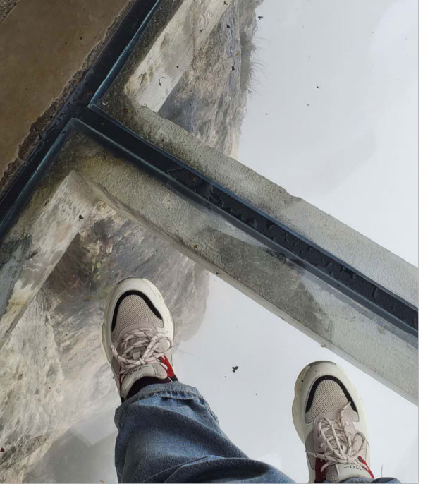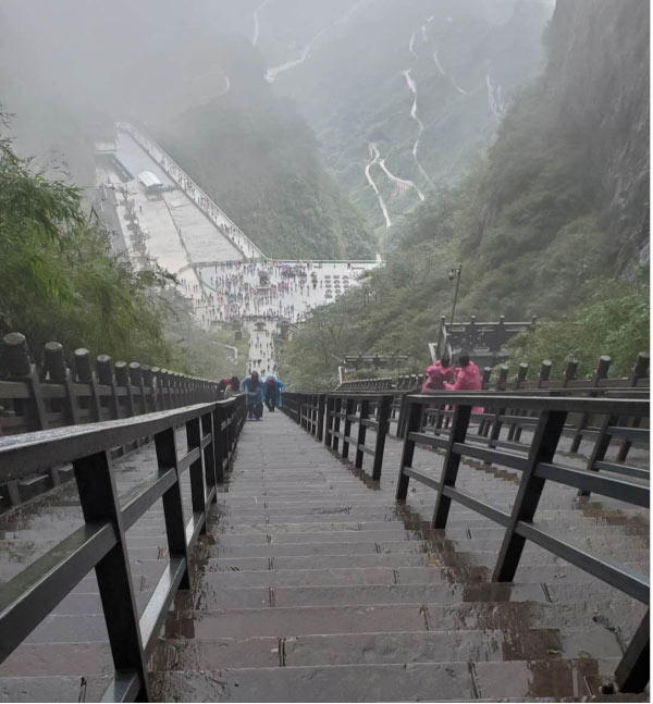 于是在我們又轉了7層電梯后,終于來到了天門洞上。依然是白茫茫的一片,天門山棧道,底下原本高聳陡峭的山崖,在白霧的襯托下,一點兒也不讓人覺得害怕了,只是雨天濕滑,內心在默默祈禱千萬不要摔倒就好。